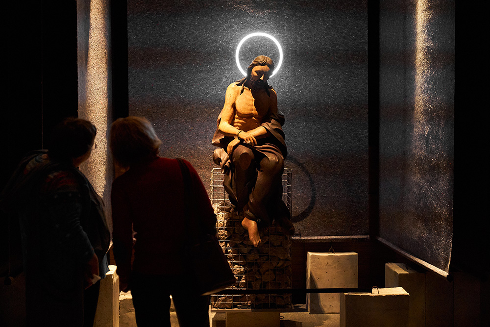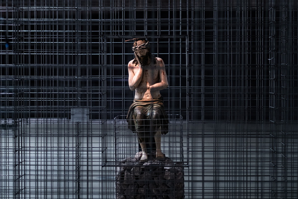 Согласно евангельским текстам, перед тем как отправиться на Голгофу (несение креста), Христос был поруган, избит и коронован терновым венцом. Между этими двумя событиями — очень недолго, короткую ночь — он находится в темнице. И именно этому моменту соответствует своей иконографией сюжет на выставке.