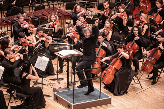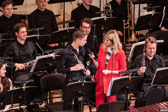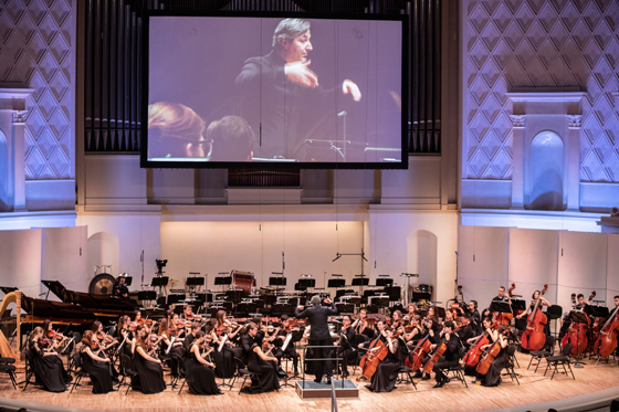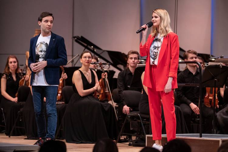 © Московская филармония «Язык музыки» На сцене — недавно созданный и весь пышущий энтузиазмом Российский национальный молодежный симфонический оркестр, состоящий из людей, более-менее близких слушателям по возрасту. Над сценой — экран, на который очень профессионально выводятся крупные планы. Вот гобоист Паша весело отвечает на вопросы пробравшейся к нему Маши с микрофоном, а вот он же, посерьезнев, играет ответственное соло в Чайковском. Вот ударная группа по очереди демонстрирует тембры своих инструментов, а вот знаменитый своей антинародной авангардностью антракт из шостаковичевского «Носа» для одних ударных вызывает бурный восторг зала.