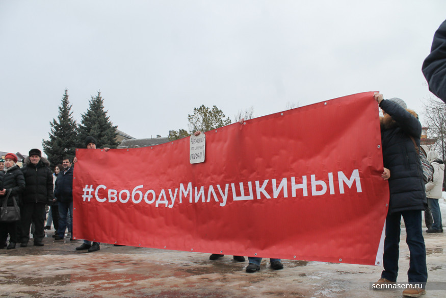 Активисты движения «Открытая Россия» держали на митинге плакат «Свободу Милушкиным». 17 января оперативники пришли в дом к координатору регионального отделения движения Лие Милушкиной и ее мужу Артёму Милушкину. Их заподозрили в сбыте наркотиков. Артём два месяца проведет в СИЗО, Лию оставили под домашним арестом. На митинге выступила мама Артёма — Ирина Милушкина. Она сказала о невиновности своего сына и его жены и поблагодарила активистов за поддержку.