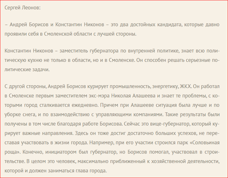 Давайте объективно взглянем на список претендентов — лесник, энергетик, риэлтор, юрист, безработный, медиамагнат, музыкальный контролер и «девушка без определенных занятий со съехавшей крышей». Да есть еще Фалевич, который как бы уже «рулил» спецавтохозяйством, то был как раз изгнан оттуда за «неудовлетворительные результаты работы». Поэтому, можно сколько угодно пенять на «похороненное местное самоуправление», но будем объективны — опыта работы, необходимой квалификации и знания самого процесса руководства городом у Борисова на порядок больше, чем у остальных. И он — реально «правильный» кандидат, если нам нужен хозяйственник, а не крикун — популист!