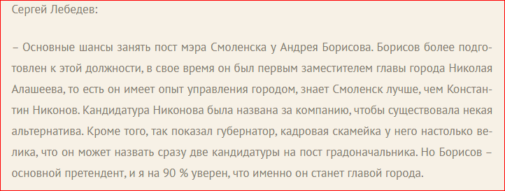 Вот и наступило 11 февраля, «день Х» для желающих стать Главой города — героя Смоленска. Хотя еще не вечер, но, думаю, что те 11 кандидатов в кандидаты и составят ту самую команду «самых достойных», либо «самых активных». Ведь не для кого не секрет, что из всех претендентов шансы есть только у одного — у Андрея Борисова. И даже не потому, что его будет поддерживать губернатор (хотя это +150 к карме кандидата и 99% к вероятности избрания), а потому что Борисов — единственный, кто реально занимался проблемами городского хозяйства еще при Алашееве. Да и в областной администрации курировал как раз область ЖКХ, что наиболее актуально для смолян!