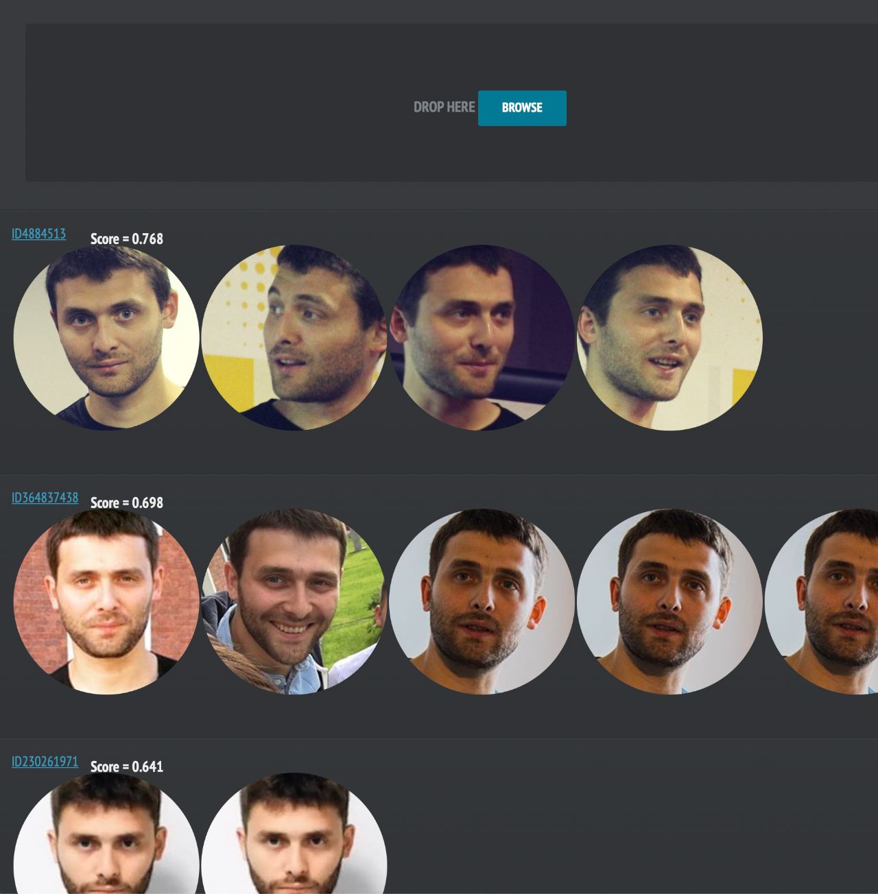 Журналист «Медузы» Султан Сулейманов загрузил на SearchFace свое недавнее фото, на котором он корчит лицо. Несмотря на «помехи», сервис смог найти не только его личную страницу, но и несколько фейковых аккаунтов, авторы которых использовали его снимки.