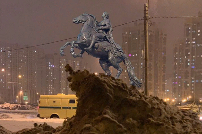 В ответ другой пользователь опубликовал мем, на котором сугроб занял место постамента Медного всадника.