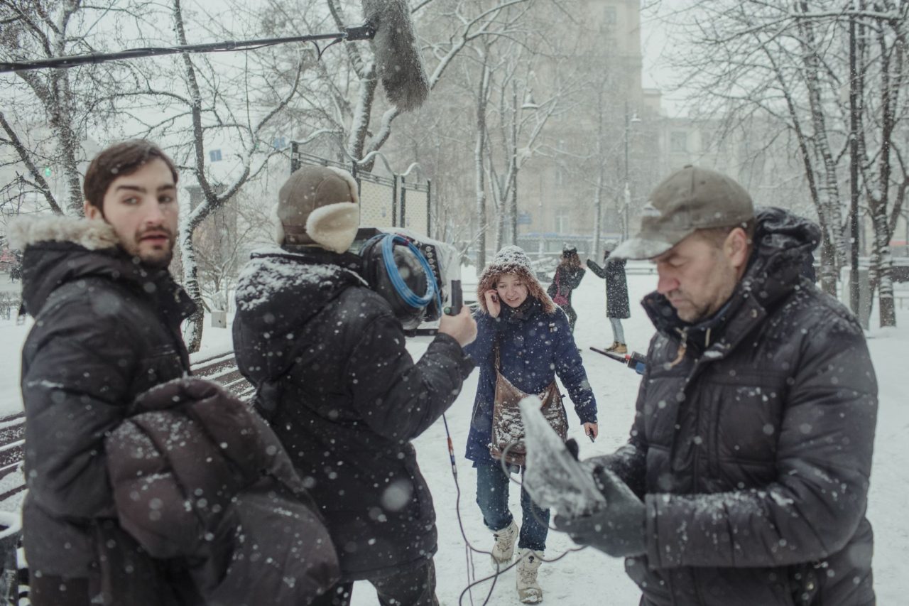 Режиссер фильма Сергей Дворцевой (2ой справа, с камерой), первый ассистент режиссера Вячеслав Агашкин, оператор Александр Мазур и актриса Самал Еслямова снимают уличную сцену. Помимо съемок на пленочную 16-миллиметровую камеру, сложность была еще и в том, что все уличные сцены должны были быть сняты во время мощных снегопадовФото: Денис Синяков ТД: Самал, насколько вам сложно или, наоборот, просто было существовать в фильме? Тем более что история Айки была написана специально для вас.