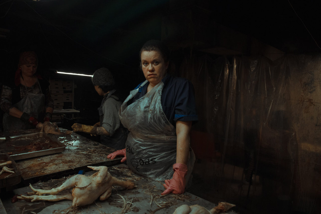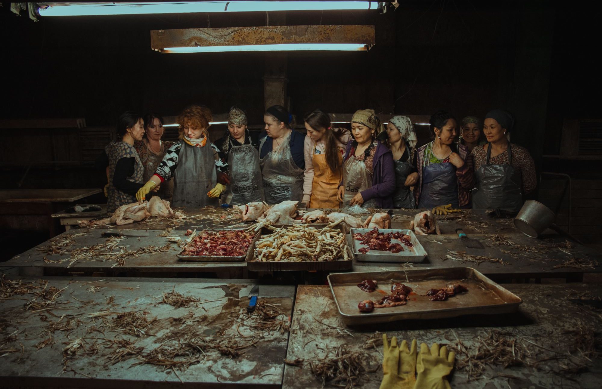 СД: Во время подготовки этого эпизода мы объездили много фабрик в Подмосковье, где обрабатывают, а потом пакуют в вакуум рыбу и курицу. Эти женщины — щипальщицы, они годами работают на этой работе, ощипывая кур. Именно они нам показали, как реально все происходит, научили Самал и всех остальных это делать.