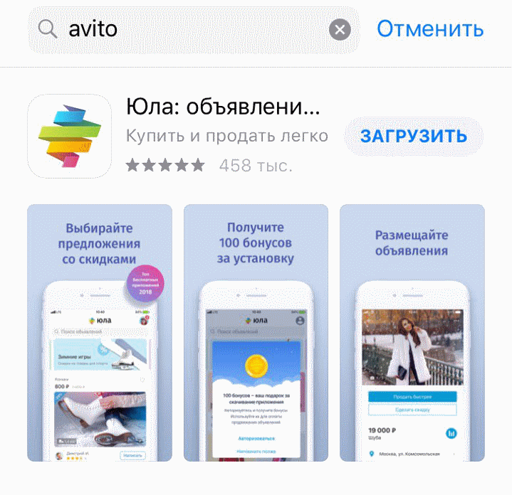 Подробнее. В настоящий момент в поиске по русскому магазину App Store по запросу «avito» выводится конкурирующее приложение «Юла».