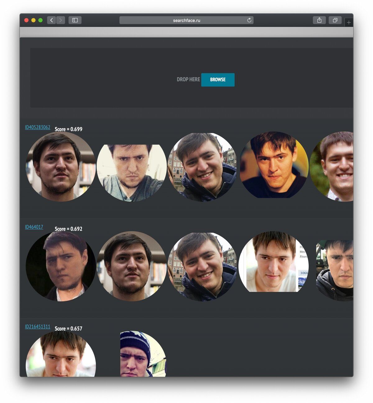 After news of SearchFace’s release began to spread, an editor for the publication TJournal managed to get in touch with one of the product’s creators. The programmer, who asked to remain anonymous, said his goal was not to make money — SearchFace has no advertisements and does not require registration. Instead, he simply wanted to research the capacities of his algorithm. Specifically, the programmer said he hoped to test the facial recognition tool on a very large set of photographs, including low-quality images and images in which part of a person’s face is hidden.