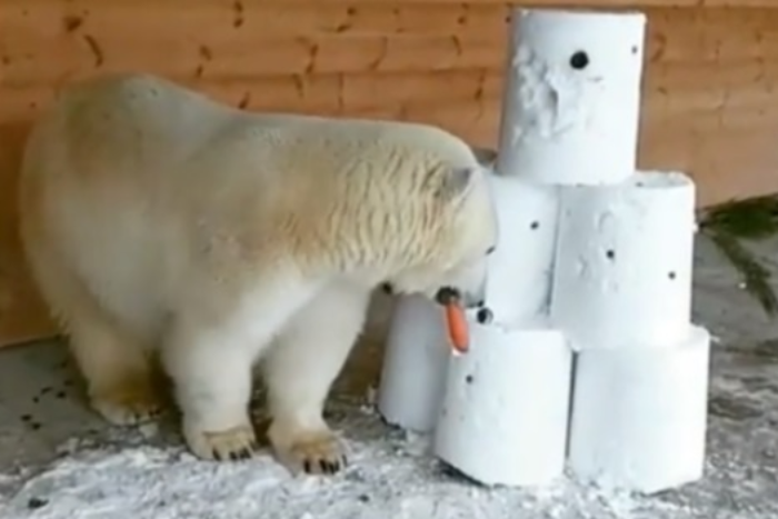 Медведице из Ленинградского зоопарка подарили снеговика — она откусила ему нос, а затем разом разрушила!