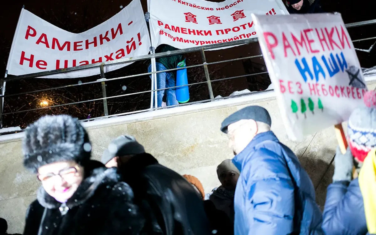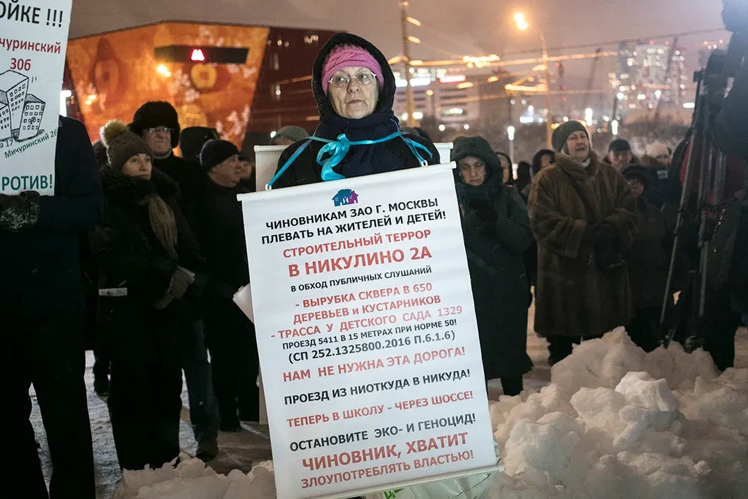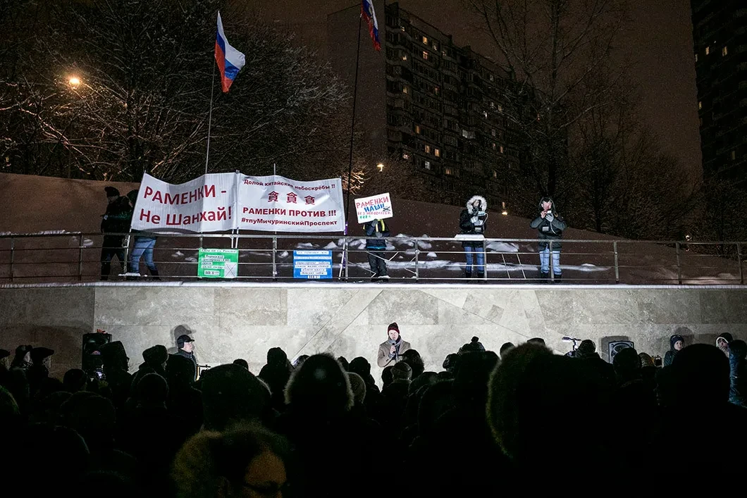 13 февраля в московских Раменках прошла санкционированная акция протеста жителей района против антинародной градостроительной политики и массовых фальсификаций подписей на публичных слушаниях. Несмотря на погодные условия около 300 человек больше двух часов протестовали около будущей стройки стометровых жилых небоскребов «Транспортно-пересадочного узла» у метро Мичуринский проспект.