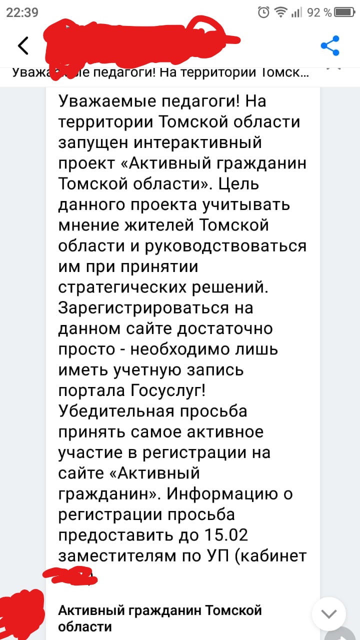 В Томске директора школ заставляют педагогов регистрироваться на портале "Активный гражданин", принадлежащий региональной администрации. Как сообщила редакции "Сибирь.Реалии" координатор местного штаба Навального Ксения Фадеева, один из учителей местной гимназии прислал в офис политика скриншоты переписки в чате преподавателей. В ней говорится не только об обязанности создать личный кабинет на сайте, но и необходимости отчитаться об этом руководству до 15 февраля.