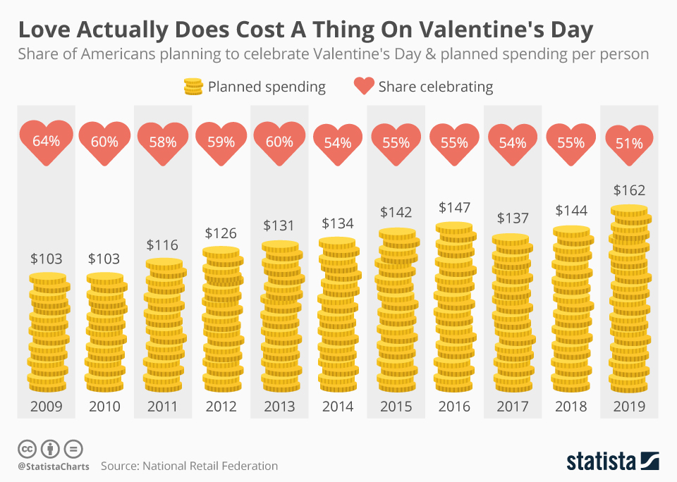 В тему ко Дню святого Валентина. Несмотря на снижение доли американцев, которые отмечают этот праздник, расходы влюбленных на открытки, цветы, шоколад и ужин при свечах в США все равно растут, следует из данных Национальной федерации ритейлеров США. По ее прогнозам, в этом году потребители потратят на празднование 14 февраля около $20,7 млн — это рекордная сумма, которая превышает показатель 2017 года на 6%. Подробнее про средний уровень расходов на человека и долю празднующих день влюбленных — в инфографике.