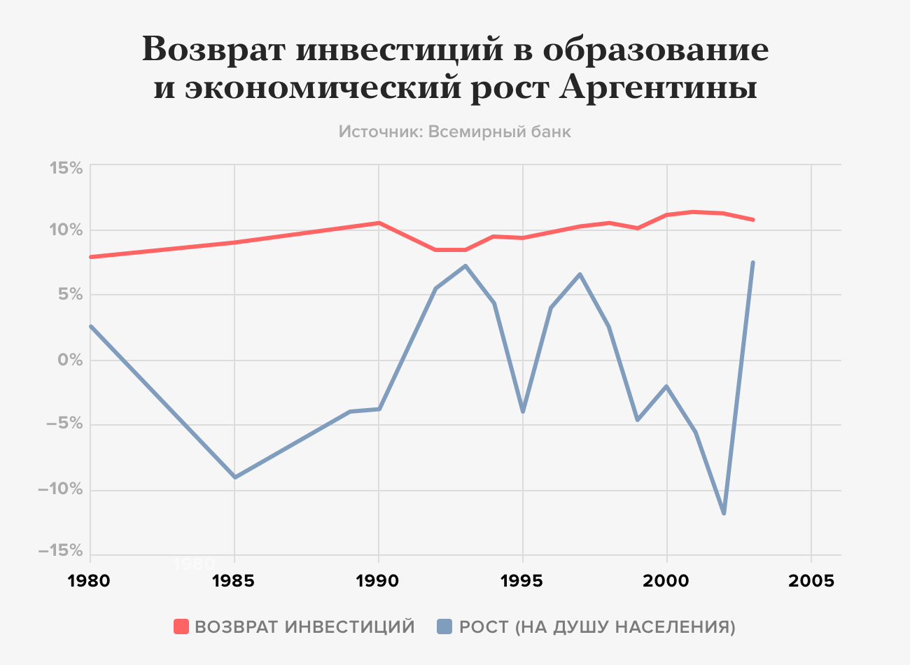 В том же исследовании Всемирного банка приводится в пример Аргентина. За последние десятилетия у нее были и резкие спады в экономике, и, наоборот, резкие скачки вверх. На доходах от инвестиций в образование это никак не сказывалось — во все времена они находились выше 5%, а иногда достигали отметки в 10%.