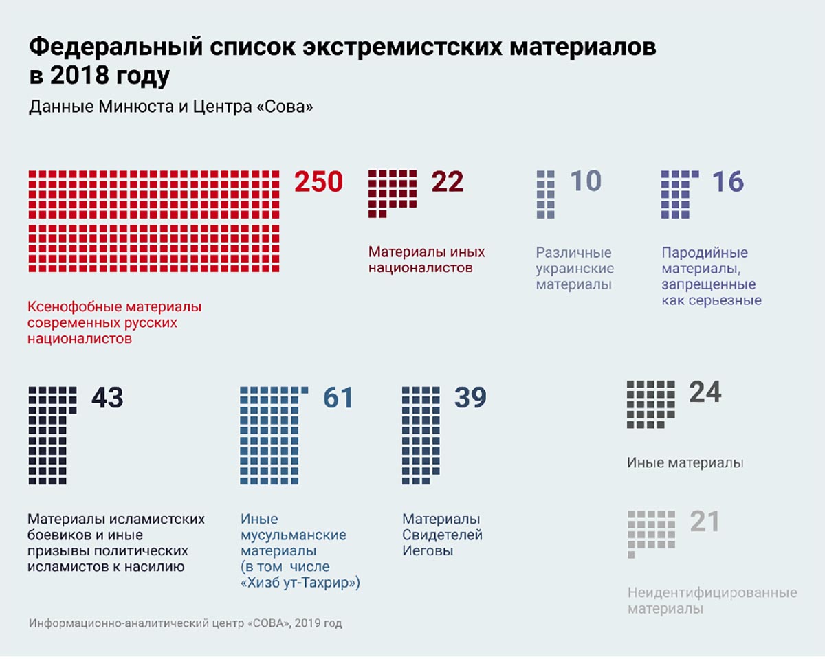 В 2018 году количество позиций в Федеральном списке экстремистских материалов увеличилось с 4335 до 4811, по сравнению с прошлыми годами снова наметился рост. Большую часть из них составляют материалы из интернета, при этом из описания непонятно, где именно расположен материал — на него закономерно не дается ссылки. Кроме того, в списке встречаются повторы.