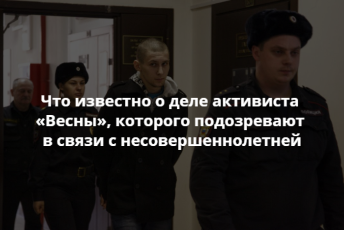 Днем 21 февраля суд в Петербурге отправил в СИЗО двух 18-летних активистов: Владимира Казаченко из демократического движения «Весна» и Вадима Тишкина, посещавшего оппозиционные акции. Следователи подозревают их в сексуальной связи с несовершеннолетней.