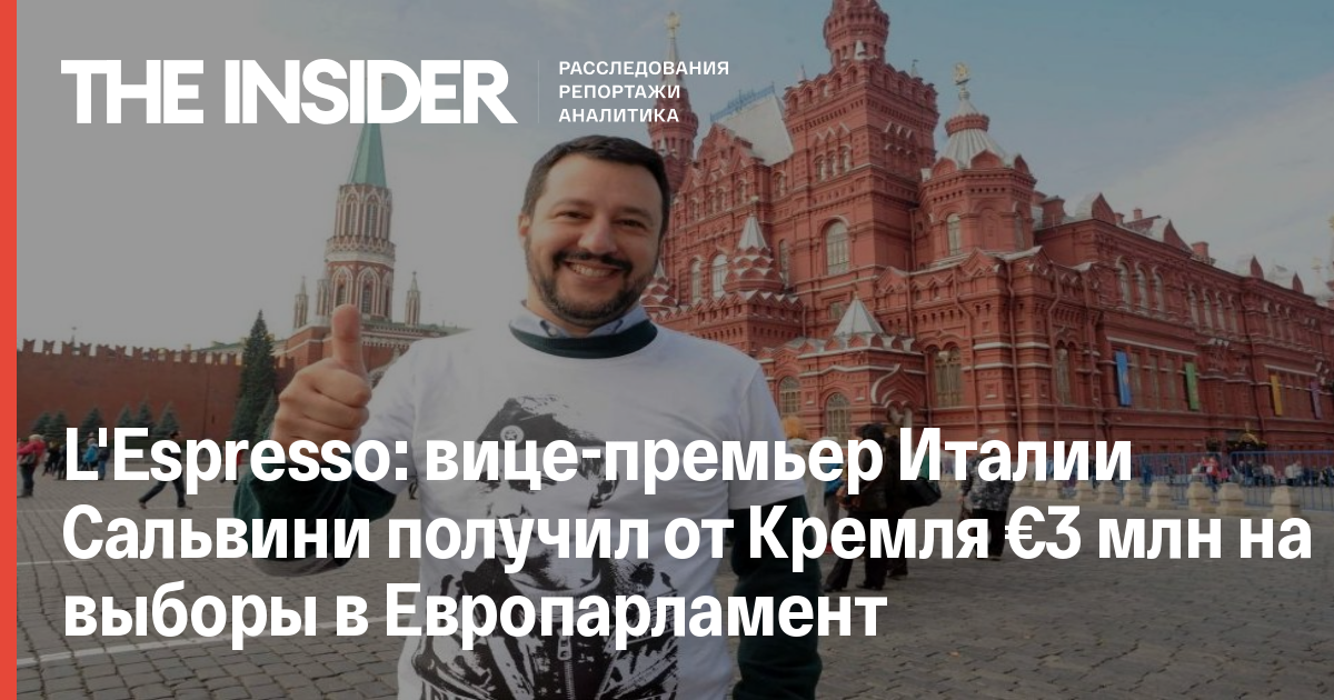 Российские компании, связанные с людьми из путинского окружения, заключили сделку по передаче €3 млн посредством фиктивной продажи дизельного топлива структурам, близким к вице-премьеру и министру внутренних дел Италии Маттео Сальвини, чтобы поддержать политика-националиста на предстоящих выборах в Европарламент. Об этом сообщается в расследовании L'Espresso.