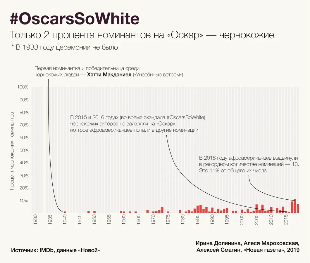 В 2016 году вокруг «Оскара» разразился крупный скандал: второй год подряд среди актеров не оказалось ни одного чернокожего номинанта. В соцсетях активно распространялся хэштег #OscarsSoWhite. При этом, по нашим подсчетам, за все время существования награды 37 лет афроамериканцы вообще не получали никаких номинаций. Только 2 процента от количества номинантов на «Оскар» за 90 лет были чернокожими.