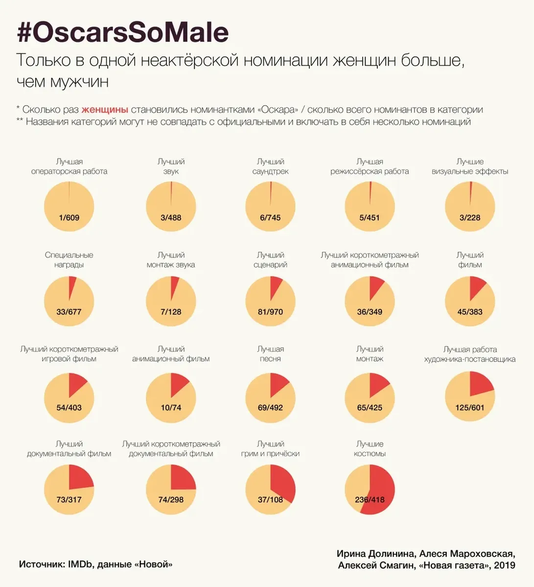 Последние несколько лет актрисы Голливуда перестали молчать о дискриминации и домогательствах в индустрии: сексуальная эксплуатация, зарплаты на одинаковых позициях в разы ниже, чем у мужчин, «закрытость» традиционно «мужских» профессий для женщин. Аналогичные обвинения в гендерной предвзятости выдвигались и в сторону премии Американской академии кинематографических искусств и наук. Под напором общественного давления «Оскар» стал понемногу менять свою политику в отношении женщин. По нашим подсчетам, за всю историю премии 2019 год стал рекордным по количеству номинированных женщин — 32 процента от всех номинантов (в расчет не брались номинации, где отмечали только лучшие женские или мужские роли всех планов). Но даже этот рекордный показатель не сильно улучшил общую картину: всего 12 процентов — женщины, женщин-победительниц только 10 процентов.