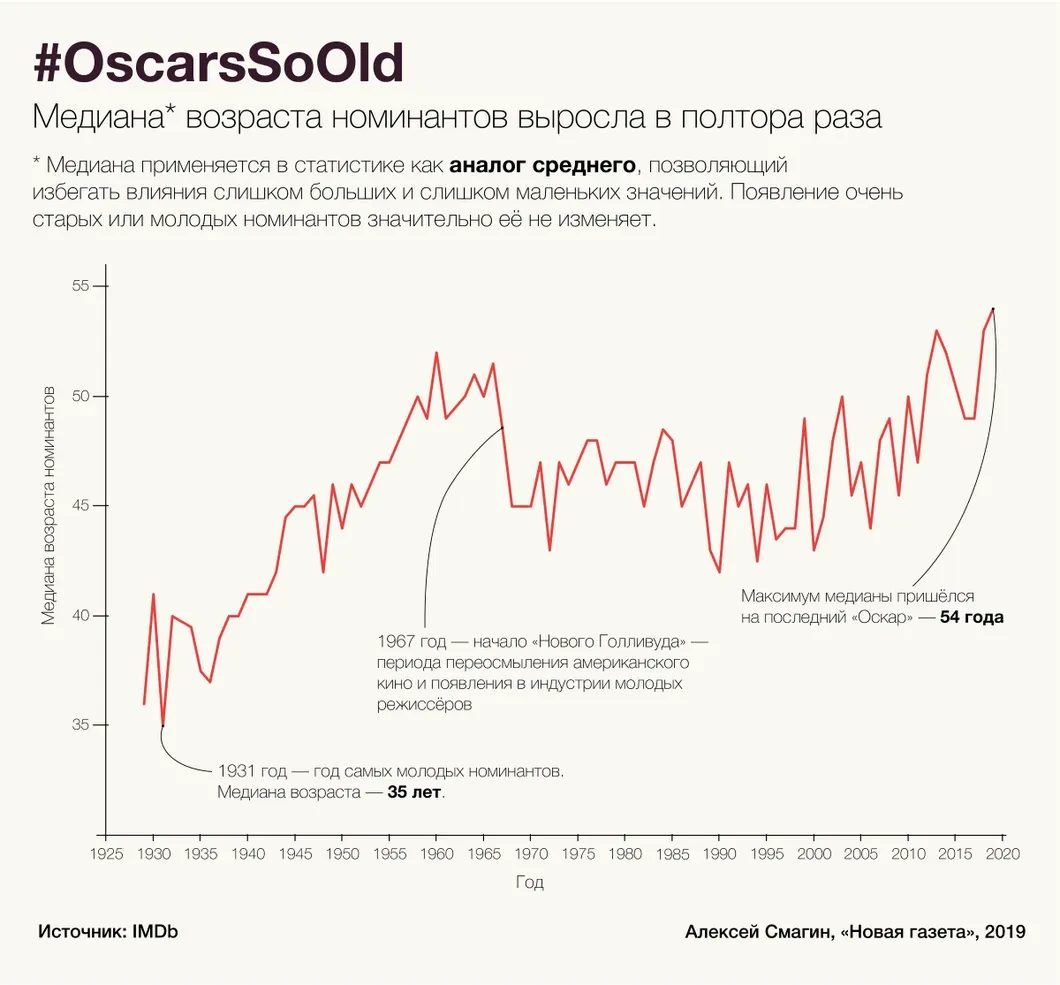 В 30-х годах ХХ века, когда кинематограф только набирал популярность, получить престижную награду молодым профессионалам было проще. Мы выяснили это, посчитав медиану возраста (все значения выписываются в порядке возрастания или убывания, нужное число находится ровно в центре). Получилось, что медиана за все время существования «Оскара» выросла на 18 лет: в 1929 году «среднему» номинанту было 36, а в 2019-м — 54.