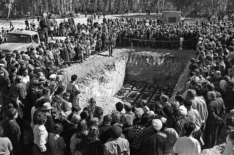 4 сентября 1993 г. Родственники погибших, пришедшие на место захороненияФото: Борис Клипиницер/ТАСС За 90-е годы было найдено порядка 120 мест массовых захоронений периода Большого террора, но, считает Флиге, стало ясно, что поиск могил каждого расстрелянного невозможен из-за отсутствия документов и технологий: «И постепенно запрос на поименный поиск — поиск захоронений конкретных людей — сменился на поиск мест, где захоронены жертвы. А жертвы в массовом сознании выражаются в численном эквиваленте и остаются лежать в безымянных могилах».