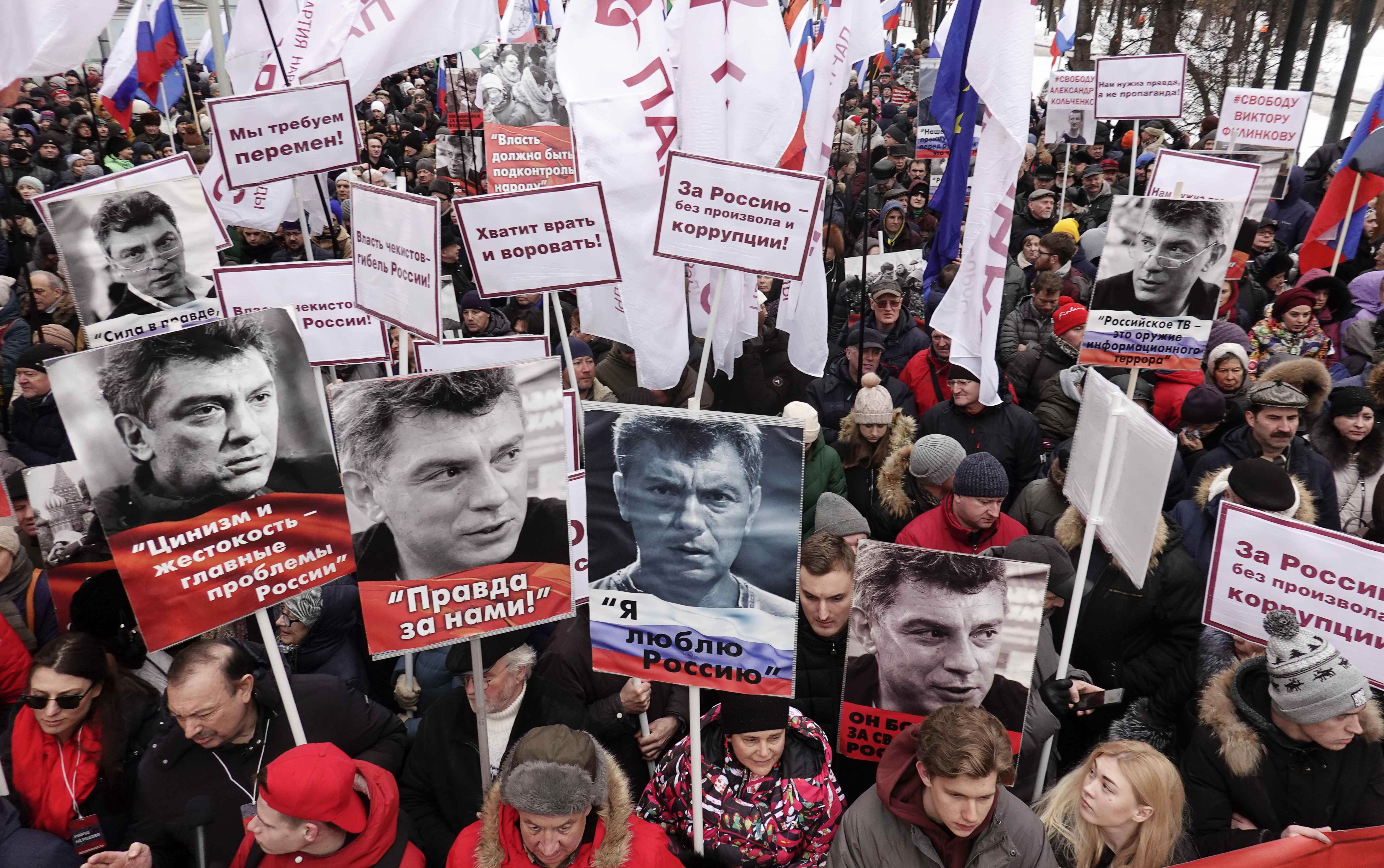 В Москве и других российских городах 24 февраля состоялся марш памяти Бориса Немцова. По данным проекта "Белые счетчики", в российской столице в нем участвовали более 10 тысяч человек, по версии полиции, 6 тысяч. В Москве маршрут марша был проложен от Страстного бульвара до проспекта академика Сахарова. Участники мероприятия держали в руках политические лозунги и портреты оппозиционного политика, убитого четыре года назад. Акции памяти Бориса Немцова были организованы также в Санкт-Петербурге, Ярославле, Нижнем Новгороде, Чебоксарах, Перми, Саратове, Владимире, Казани, Воронеже и других городах.
