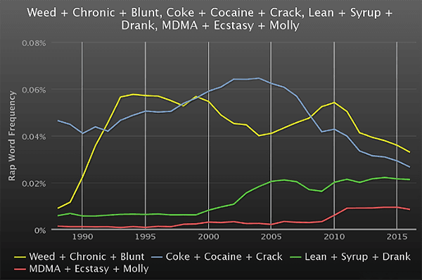 Тем не менее культура наркопотребления и рэп вслед за ней сильно изменились. По данным ProjectKnow, начиная с 2004 года упоминания кокаина и крэка в песнях идут на убыль. Зато с 2003-го резко возрастает количество упоминаний кодеиновых сиропов от кашля. На 2008-й и 2009-й приходится резкий скачок упоминаний фармацевтических препаратов — ксанакса, викодина, аддерола и других. С 2011 года в моду входит МДМА. Топливо для рэп-лирики всё чаще становится химическим. Кривые от Genius 2015 года показывают, что упоминания синтетических препаратов сегодня, вероятно, уже побили по популярности более традиционные наркотические вещества: