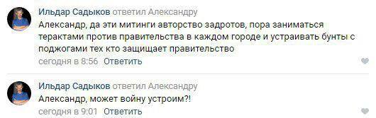Комментарий Садыкова, послуживший поводом к фабрикации дела, удален. Можно предположить, что внимание властей привлекло заявление новосибирца, сделанное 22 июня прошлого года в одном из местных пабликов сторонников Алексея Навального под публикацией о готовившемся митинге против пенсионной реформы. Сохранился скриншот двух комментариев Садыкова, в которых тот называл организаторов митинга "задротами" и предлагал "войну устроить". Сторонники Навального сочли Садыкова провокатором.