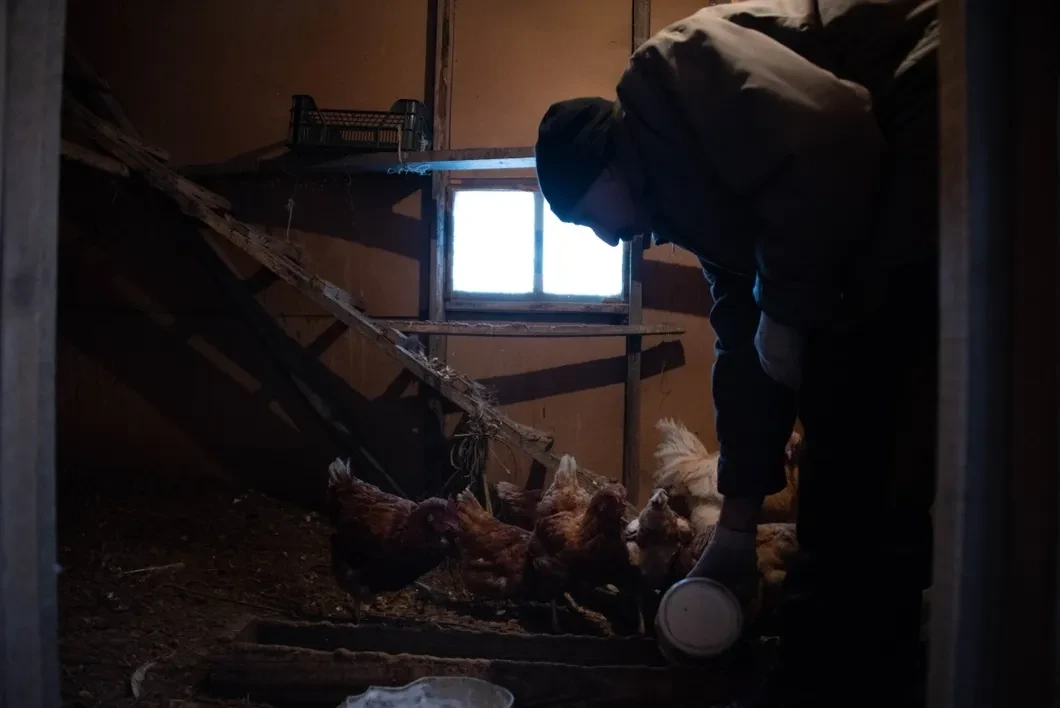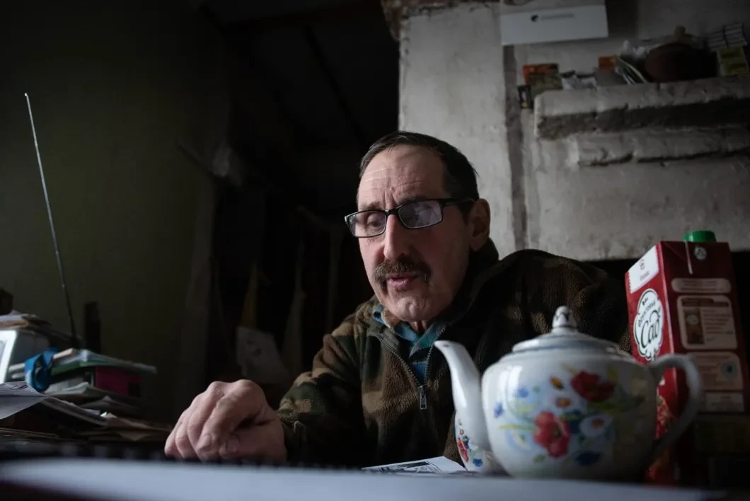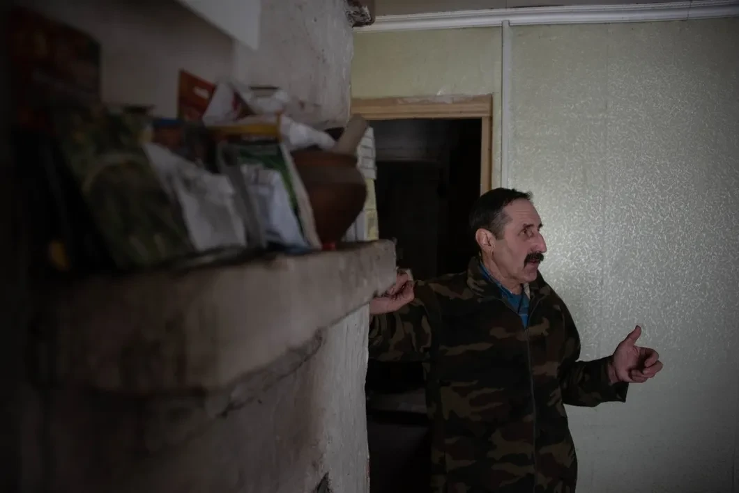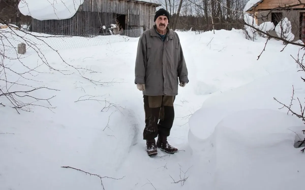 Рядом с нами на угловой скамье старенького гарнитура лежат выцветшие номера «Новой газеты» — кроме «Радио России», наша газета единственный источник информации для Алексея Аполлоновича (он шутит, что слушает «хорошие» новости, а потом сравнивает их с «плохими»). За «Новой» он ходит по пятницам на почту в соседнее село. И по пути успевает собрать с обочины несколько килограммов мусора. Алексей Аполлонович рассказывает о себе и изредка подкладывает в печь несколько поленьев. Эта печь — единственный источник тепла в доме. Воды у Алексея Аполлоновича дома нет — за водой он ходит на ручей.