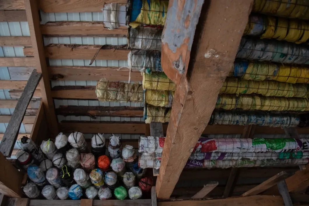 — Человек 10 прониклись моими идеями, — говорит Алексей Аполлонович, поднимая к потолку палец с черной каймой под ногтем. — Из разных деревень. Вот они мне собирают, складируют. Когда я понимаю, что объем набрался, — нанимаю машину, вывозим. Два раза в год у меня получается этот вывоз — весной и осенью. Вот я все это привожу сюда. В мешках у меня предварительная сортировка сделана — то есть люди мне раздельно уже собирают. Открыл мешок — тут пластик, ага, поставил. Тут банки брякают. Здесь, значит, звенят стекляшки. Тоже хорошо. Вот что главное: то, что обычно делается на мусороразделочных предприятиях, у нас делается уже дома, людьми самими.