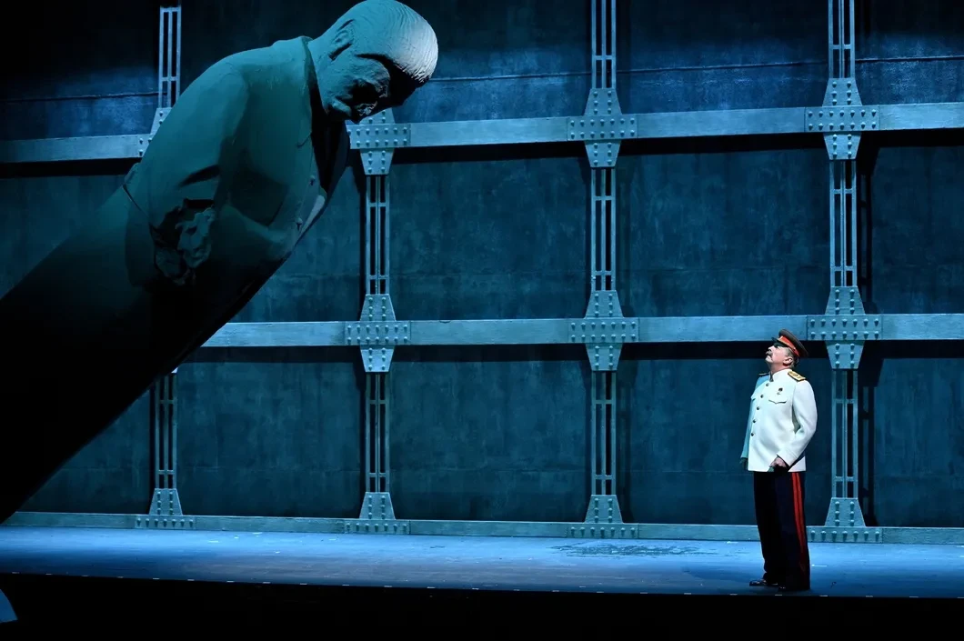 И тут из оркестровой ямы медленно поднимается гигантский памятник Сталину. Он замрет, но не выпрямится до конца, снова уйдет в яму…