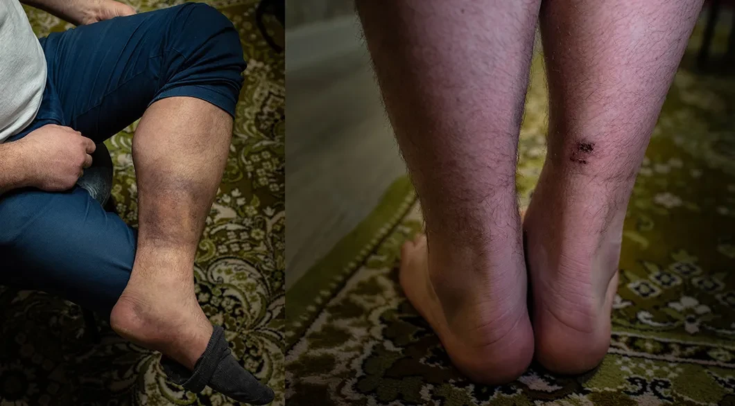 Вячеславу Бороносу чуть больше пятидесяти лет. На его ногах огромные синие гематомы и следы от шокера. После обысков всю его семью привезли в следственный отдел.