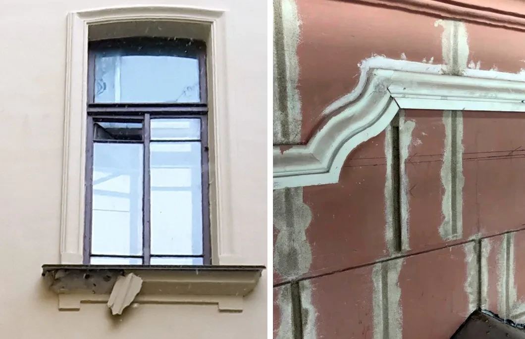 Исторические кованые козырьки распилили, нанесенная в мороз по фасадам краска растрескалась. Жильцы дома Бака обвиняют подрядчика в обмане, подлоге и давлении, а он их — в излишней эмоциональности.