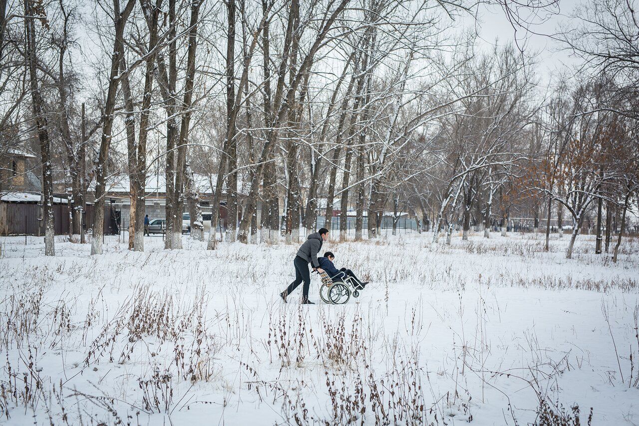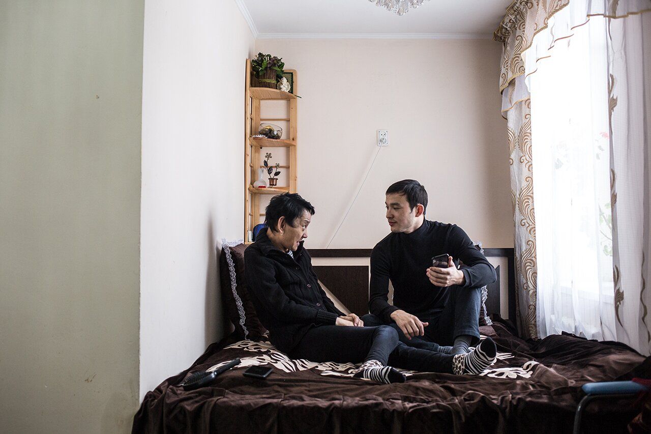 In 2017, a news report was published about Maksat and Aisara’s story. It was titled “Help — I’m barely holding on,” and it quickly led to a segment on the Kazakhstan TV channel as well. As in the Trubnikovs’ case, publicity helped: Kazakhstanis sent the Aimans almost 1.5 million tenge (about $5,000), which finally enabled Maksat to hire a caregiver and find work. Nonetheless, he has had to switch jobs three times since. Even with his mother’s extra care, Maksat regularly has to leave work unexpectedly in the middle of the day to help her.