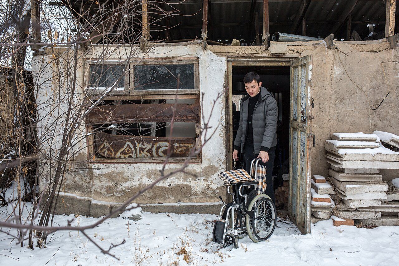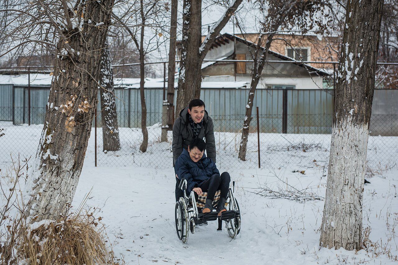His life became a closed circle. To hire a caregiver for his mother, Maksat had to find work, but he couldn’t find work because he had to help Aisara. It was only then that the young man really began hating his way of life. “I was a young guy! I really wanted to work, exercise like I had before, get something done, but I literally couldn’t take a step away from my mom. That feeling of helplessness and the sense that it was impossible for me to change anything at all did lead me to take things out on myself,” he remembered. “The only luxury I could afford was reading books. I read books about people with disabilities to understand how I could motivate my mom and how I could try and help her.” Every day, the young man gave his mother a massage, took her out for a walk, and made her do a set of exercises. In his words, Aisara would smile, and they were “truly happy” as a family. Maksat said he took out his anger only on himself — never on his mother.