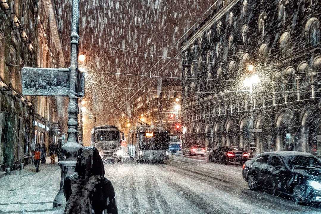В Петербург в начале марта пришла зима. Дороги завалены снегом, водители весь день стоят в пробках. Из-за сильного ветра в городе объявлен желтый уровень опасности.