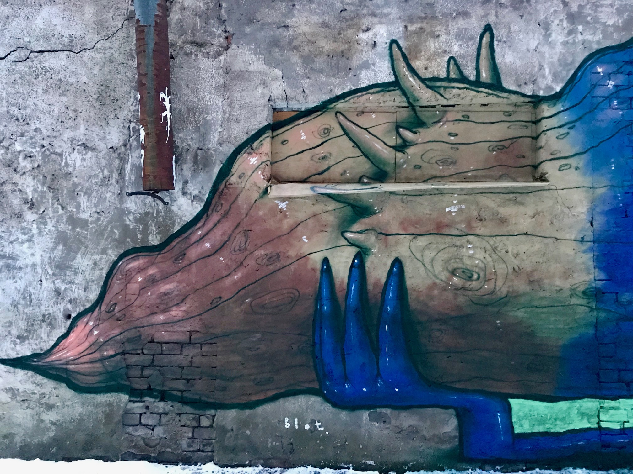 Художник Александр Blot работает на улице со спреями и водоэмульсионной краской на металле, кирпичах и бетоне, отмечают в Институте.