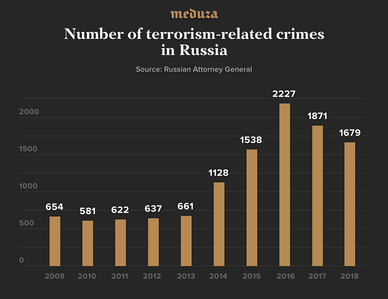 No, published statistics actually contradict Putin’s claims directly. Terrorist-related felonies belong to a criminal category all their own, which the Attorney General’s Office defines clearly and presents separately in all statistical reports. Here are how the numbers break down over the past decade.