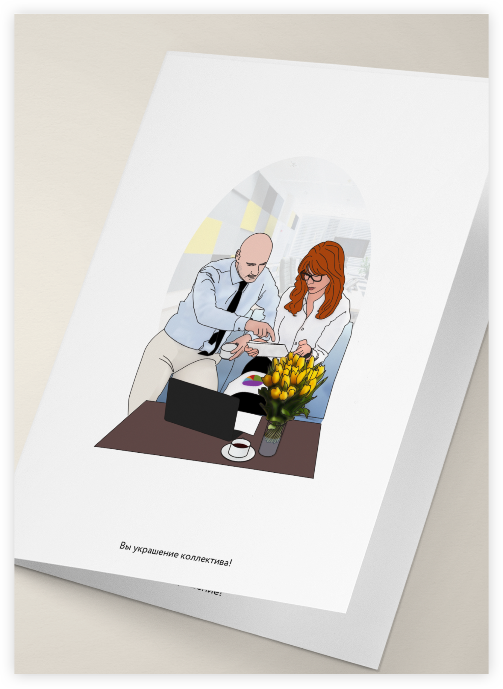 На обложке каждой открытки написаны пожелания, а при ее раскрытии можно найти еще одну фразу, которая дополняет первую. Например, на одной из них есть надпись «Вы украшение коллектива», а на второй странице открытки сказано «Я не украшение». На открытках также есть иллюстрации.