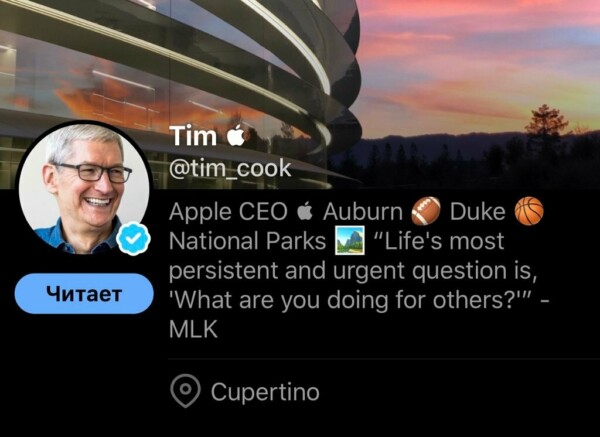 Тим Кук сменил имя на «Тим Эппл» в Твиттере после того, как Дональд Трамп назвал его так по ошибке. Для этого гендиректор Apple использовал значок логотипа компании, который отображается только на устройствах Apple.