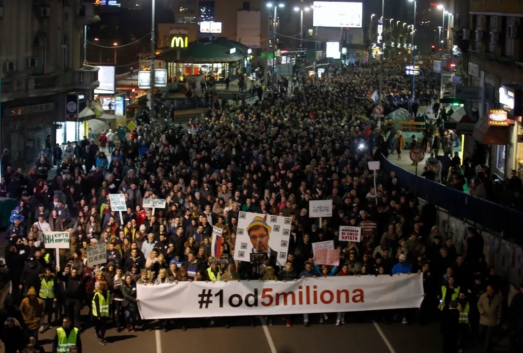 В последнюю субботу февраля, сообщал ТАСС, тысячи людей вышли на площадь вблизи философского университета в Белграде с требованием отставки президента и министра здравоохранения Златибора Лончара. В руках у многих пожилых участников акции были плакаты с требованием вернуть пенсии — выплаты урезали в ходе экономических реформ в Сербии. Основной лозунг несли на гигантском транспаранте во главе колонны: «Один из пяти миллионов». Эта фраза отсылает к словам Вучича о том, что он не допустит незаконного захвата власти, «даже если протестующих будет пять миллионов» (для сведения: все население страны — семь миллионов). Колонны демонстрантов возглавляли автомобили с динамиками, из которых звучал сербский рок и традиционные протестные песни. Этому шествию, как и другим подобным в Сербии, полиция не препятствовала, обеспечивая прохождение колонн.