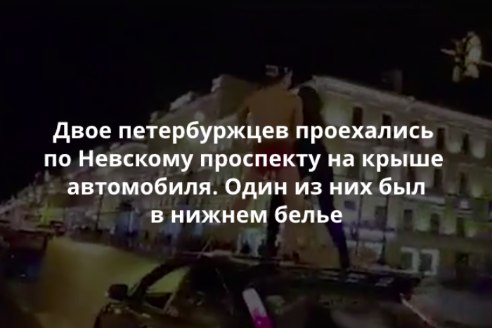 Двое петербуржцев в ночь на 11 марта проехались на крыше автомобиля по Невскому проспекту. Видео заезда авторы ролика опубликовали в группе «Признавашки ДТП и ЧП». На крыше автомобиля находились девушка и мужчина в нижнем белье. Еще один участник ехал, почти полностью высунувшись из окна автомобиля. Он также был в нижнем белье.