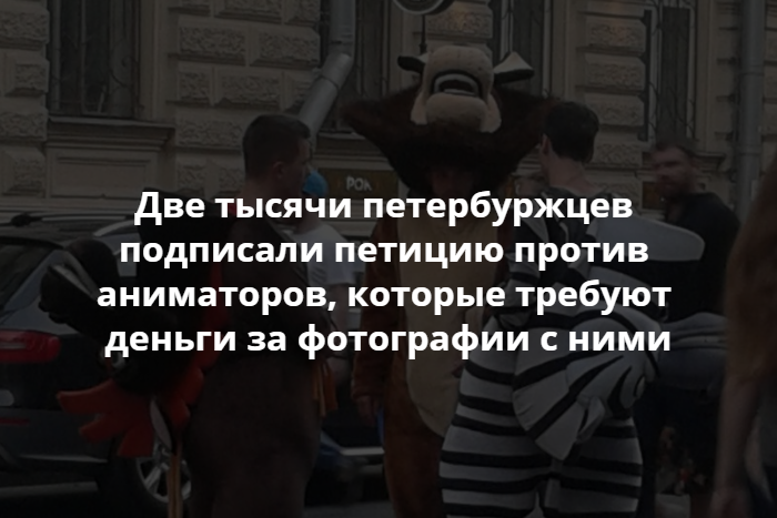 Петицию адресовали администрации Петербурга, врио губернатора Александру Беглову, МВД и СК. Жители просят убрать с улиц аниматоров, которые требуют деньги за фотографии с ними, а также провести проверку их деятельности. Петицию подписали более 2 тысяч человек.