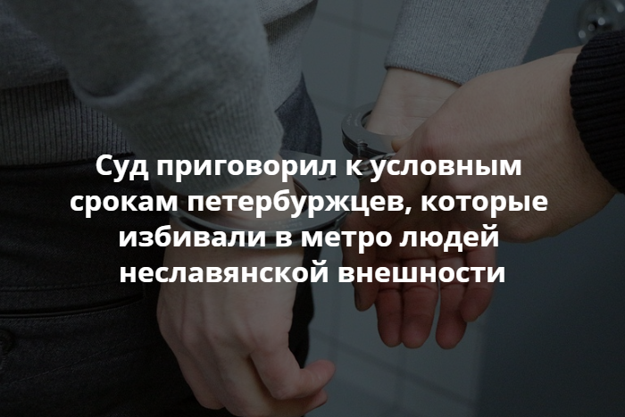 Ленинский районный суд Петербурга приговорил к условным срокам Сергея Павлова и Дмитрия Козлова, которые в декабре 2017 года избили в метро нескольких людей неславянской внешности. Об этом сообщает объединенная пресс-служба судов города.