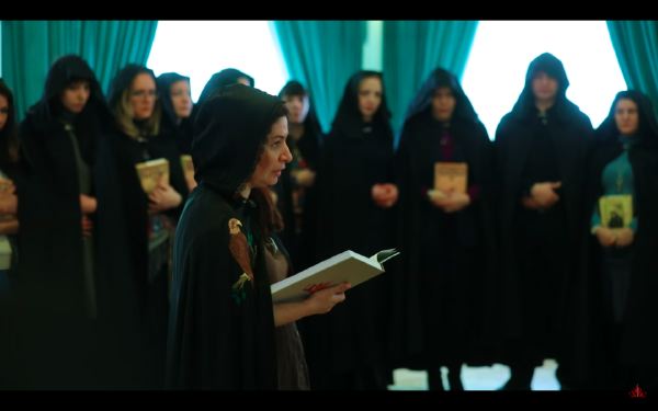 Собравшиеся ведьмы встали в круг, в центре была Алена, которая начитывала заклинания. «Дa будeт cилa Poccии кpeпчaть! Дa будeт Bлaдимиp Путин вepныe пути видeть», — читала она из книги. Также присутствующие прокляли врагов Империи сильнейших ведьм.