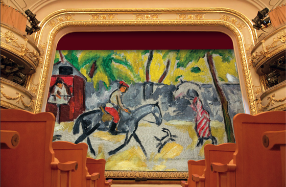 Все потому, что для подъемного занавеса была выбрана авангардная живопись — работа Михаила Ларионова «Улица в провинции».