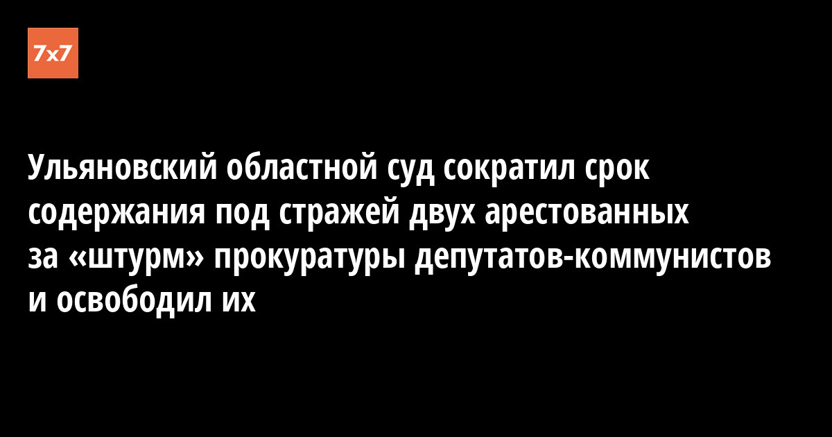 Ульяновский областной суд после апелляции 14 марта сократил срок содержания под стражей двух арестованных за «попытку прорваться» на прием к областному прокурору депутатов-коммунистов Виталия Кузина и Дениса Гурьянова и освободил их, сообщил корреспондент «7x7». 12 марта Ленинский районный суд арестовал их на семь дней.