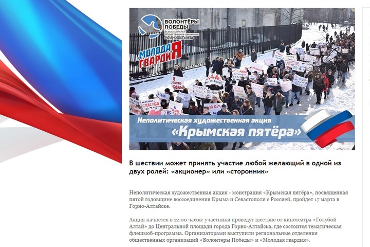 Реготделение «Единой России» в Республике Алтай опубликовало анонс «неполитической художественной акции „Крымская пятёра“». Шествие проведут прокремлевские движения «Волонтеры победы» и «Молодая гвардия».