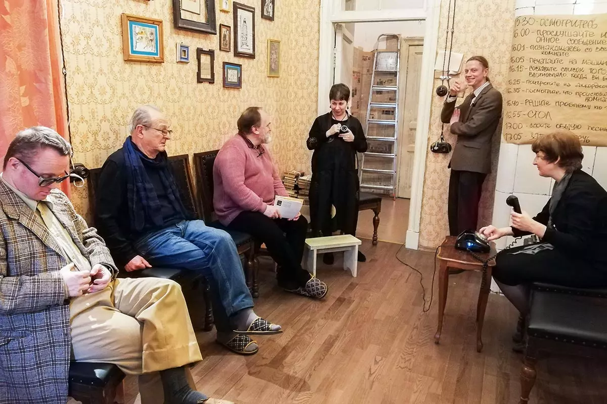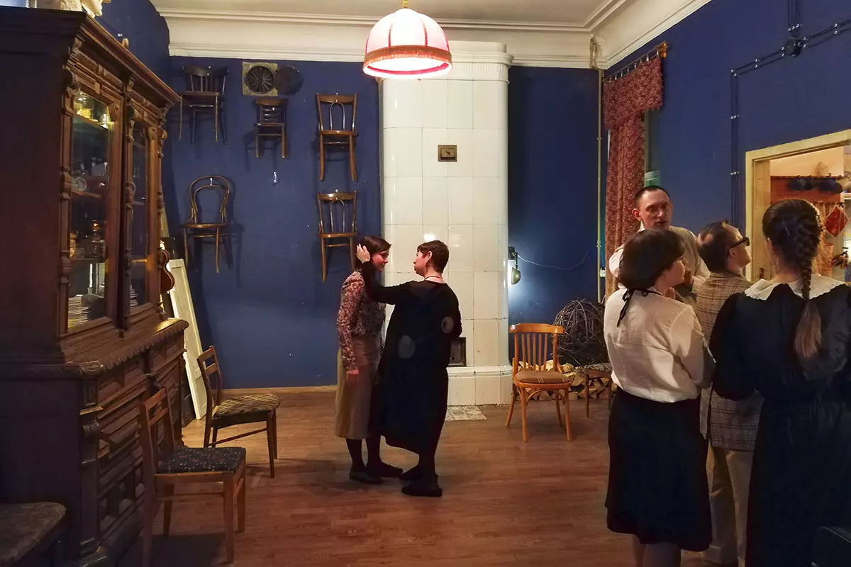 Сегодня «Квартира» полна необычных гостей. На спектакль приехали члены жюри премии «Золотая маска». Они рассредоточились по комнатам и выполняют указания, написанные на настенных памятках.