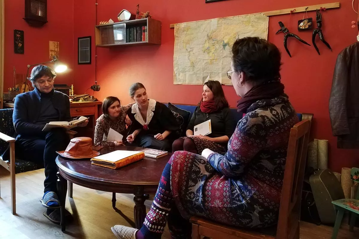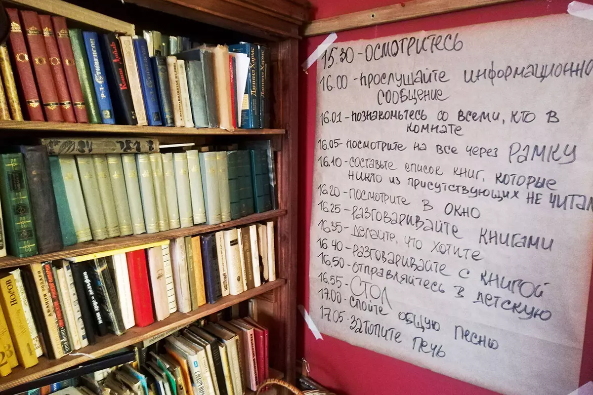 В гостиной начинается чтение по ролям маленьких абсурдных диалогов. Гости читают парами — между собой и вместе с ребятами. Атмосфера теплая, дружеская. Потом из стульев, развешенных по стенам, строят крепость. А после — читают список любимых и нелюбимых вещей и явлений в мире.