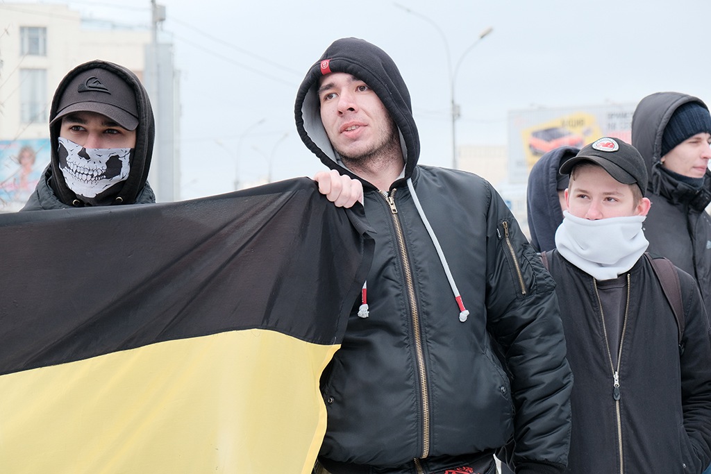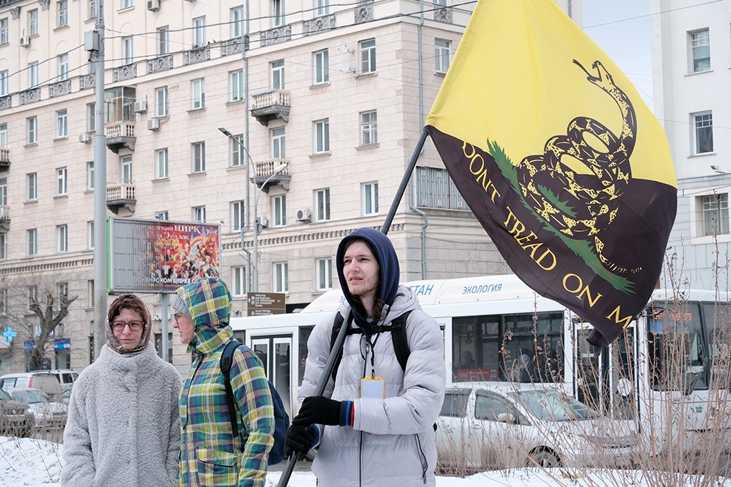 Уже после начала пикета несколько молодых людей принесли имперский триколор. «Вот наконец-то флаг интернета принесли», — пошутил кто-то.