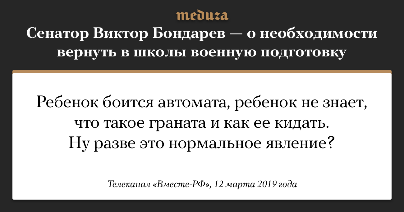 Бывший главнокомандующий ВКС Виктор Бондарев, возглавляющий комитет Совета Федерации по обороне, призвал министра просвещения Ольгу Васильеву вернуть в школы уроки начальной военной подготовки. Бондарев выступил с обращением во время встречи с министром 12 марта. Некоторые СМИ, например «Эхо Москвы», сразу же обратили внимание на выступление сенатора, но другие, в том числе (увы) «Медуза» заметили его только сейчас (но не можем пройти мимо).